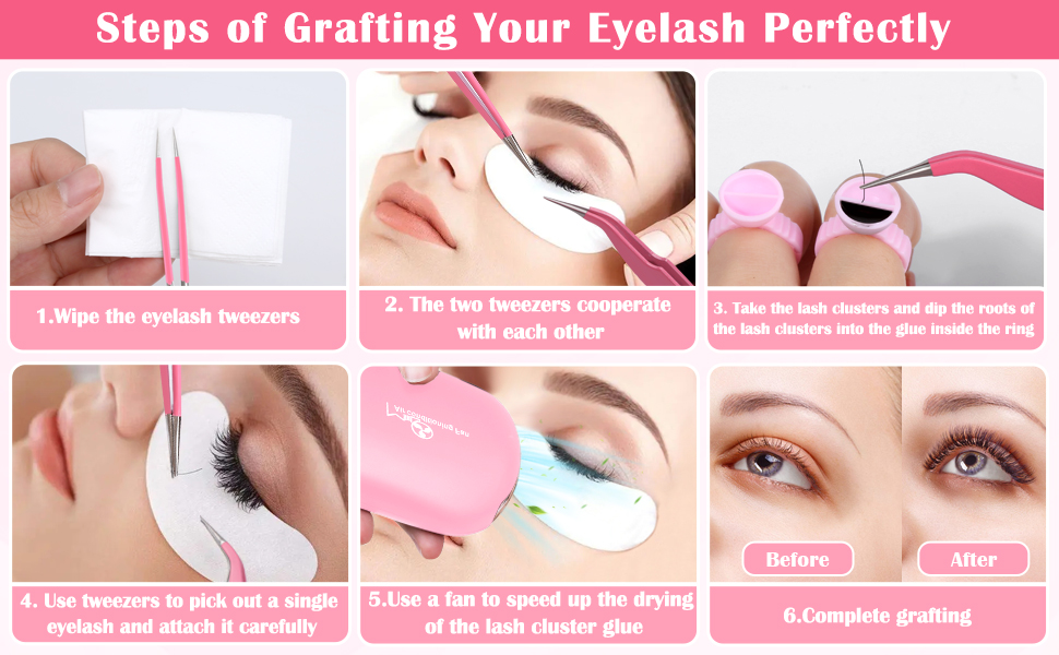 【Eyelash Extension Kit for Beginners & Professional 】Lash extension supplies kit includes 1 pc of hand-held USB mini air conditioning fan with a lanyard and data cable, 1 pack D Curl 0.07mm eyelash clusters mixed 8-15mm length, 10 pcs eye gel pads, 1 pc straight eyelash tweezer, and 1pc curved eyelash extension tweezer, 2 pcs lash extension tapes, 50 pcs glue ring holders, 50 pcs micro mascara brushes, 100 pcs lash mascara brushes spoolies and 1box. (Warm Tips: eyelash glue is don't include)