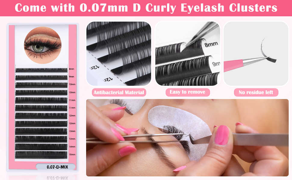 【DIY Individual Lash Extensions Supplies】1 Pack D Curl, 0.07mm lash clusters mixed 8-15mm Length. These individual clusters of eyelashes are made of high-quality synthetic fiber, very close to mink hair. High-quality lashes are soft, silky, and glossy. Volume lash extensions can be removed by eye makeup remover, simple to use and comfortable to wear. Lash extension clusters are perfect for professional, makeup salons, cosmetic schools, makeup artists and personal home use, etc.