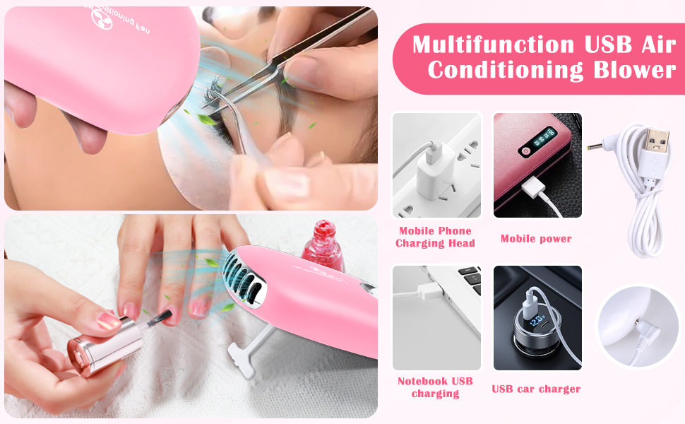 【USB Rechargeable Eyelash Fan Dryer】This USB lash fan dryer for eyelash extensions is designed without blades, safe enough and the built-in cooling system can blow out cold air to help the glue-grafted eyelashes dry quickly. A T-shaped bracket on the back can make it stand on the table, convenient for drying nail glue. The air conditioning fan comes with a USB charging cable you can carry it in your pocket or bag anytime and anywhere wherever travel or on business trips.