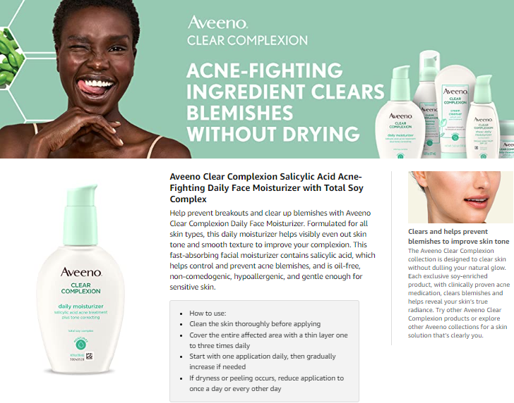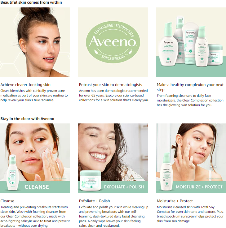 Aveeno Clear Complexion Daily Face Moisturizer helps prevent breakouts and clear up acne blemishes. Formulated for breakout-prone skin but suitable for all skin types, this daily facial moisturizer contains 0.5% salicylic acid acne medicine to control and prevent acne blemishes. Uniquely formulated with Total Soy Complex, this moisturizing lotion helps visibly even out skin tone and smooth texture to improve your complexion and help skin look and feel healthier. This fast-absorbing acne moisturizer is oil-free, non-comedogenic, hypoallergenic and gentle enough for sensitive skin. The Clear Complexion collection is designed to clear skin without dulling your natural glow. Each exclusive soy-enriched product, with clinically proven acne medication, clears blemishes and helps reveal skin's true radiance. Try other Clear Complexion skincare products or explore other Aveeno collections for a skin solution that's clearly you. Aveeno has been dermatologist recommended for over 65 years.