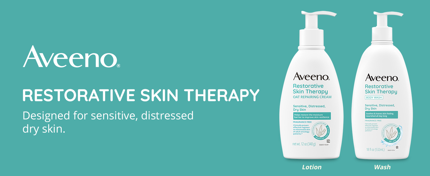 Help restore & revive dry skin with Aveeno Restorative Skin Therapy Oat Repairing Cream. From a dermatologist-recommended skincare brand, moisturizing body cream nourishes sensitive, distressed, dry skin. This daily lotion helps restore skin's natural moisture barrier to improve its resilience & is part of a clinically proven effective regimen on the distressed skin of adult oncology patients.* In user tests, 87% agree that this restorative body cream provides long-lasting comfort & leaves skin looking visibly healthier.* This formula moisturizes to soothe & help heal dry skin with prebiotic oat concentrate, aloe & pro-vitamin B5. The gentle, non-comedogenic lotion is non-greasy & is free of fragrances, parabens & dyes & packaged in a bottle made with 30% Post-Consumer Recycled Plastic. *Tested on sensitive, distressed, mild to moderate dry skin of adults undergoing systemic oncology treatment in combination with Aveeno Restorative Skin Therapy Body Wash and Itch Relief Balm.