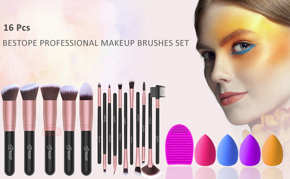 BESTOPE 21 Pcs Makeup Brush Set : 16 Makeup Brushes + 4 Makeup Sponges Blender + 1 Makeup Brush Cleaner Mat