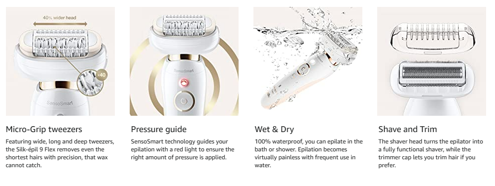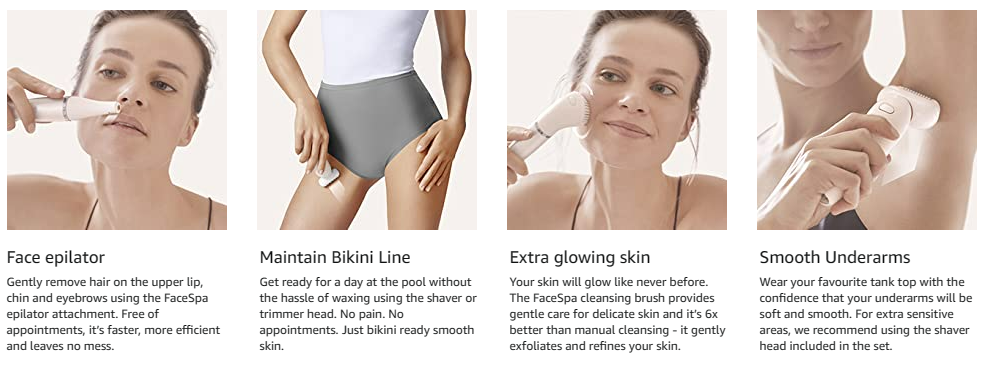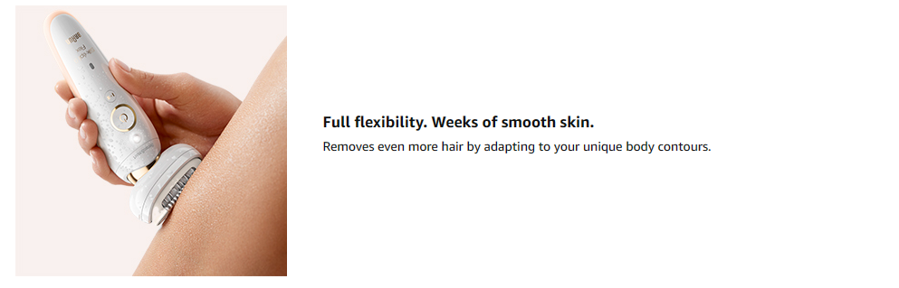 The new Braun Silk-epil 9 flex 9-300 beauty set is the World's 1st epilator for Women with a fully flexible head, for effortless hair removal. Enjoy weeks of salon-smooth skin thanks to micro-grip technology and a 40% wider head that removes hairs as short as 0.5mm. The beauty set includes 4 additional attachments so you can shave, trim, massage and exfoliate, plus FaceSpa with a facial epilator, cleansing brush to break free from skin impurities and massage pad for skin vitality. Box includes: 1 x epilator 1 x shaver head 1 x trimmer head 1 x Braun FaceSpa 1 x FaceSpa epilator 1 x FaceSpa cleansing brush 1 x FaceSpa massage pad 1 x pouch 1 x body massage pad 1 x cleaning brush 1 x charger 1 x AA batteries