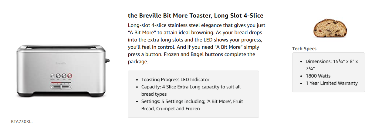 How do you perfectly toast any slice no matter what type of bread? Add an extra 30 seconds for well that little bit more. The Breville BTA730XL Bit More toaster also features a 'Lift & Look' Lever which raises and lowers the carriage to show the browning progress without interrupting the toasting cycle. Additionally, the high lift feature raises the carriage approximately a 1/2 inch making it easier to remove smaller items such as English Muffins.