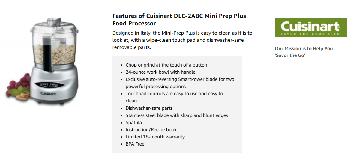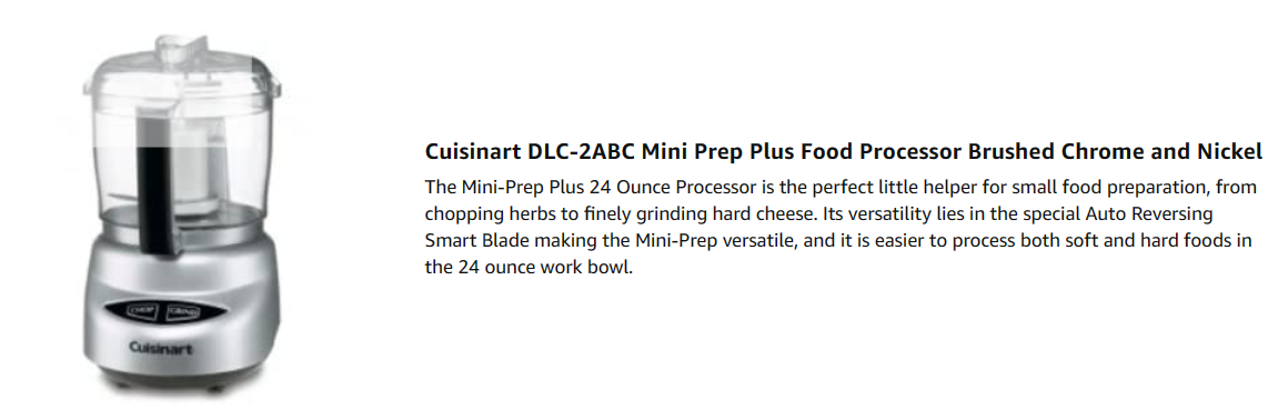 | Included Components | Cuisinart DLC-2ABC Mini Prep Plus Food Processor Brushed Chrome and Nickel |