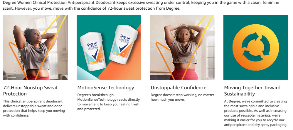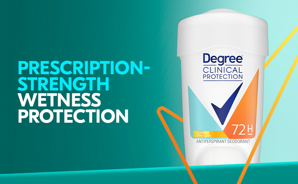 Degree Clinical Protection Summer Strength Antiperspirant Deodorant delivers prescription strength wetness protection, so you can face the day with confidence. This antiperspirant for women features 72 hour sweat and odor protection and the summer scent of green apple and peach, blended with notes of gardenia, jasmine and rose for an invigorating, clean feeling. Only Degree has MotionSense technology that moves in sync with your body. This clinical strength antiperspirant deodorant releases a burst of subtle fragrance every time you move, for nonstop protection. Degree Clinical Protection Summer Strength Antiperspirant Deodorant keeps you feeling fresher, drier, and more confident. This powerful antiperspirant deodorant responds when you need it most so that you don't have to worry about slowing down. Simply swipe and start moving. This antiperspirant deodorant for women with an invigorating scent gives you the confidence to keep moving all day long. Degree Clinical Protection Summer Strength Antiperspirant Deodorant keeps you feeling cool, fresh and protected from sweat and odor. Degree gives you the confidence to keep moving, however you move. At Degree, we want to inspire the confidence in everyone to move more and go further. We’re here to support your journey through an antiperspirant that moves with you and helps you go beyond your limits. As well as increasing our use of reusable materials, we’re making it easier for you to recycle our antiperspirant and dry spray packaging. Degree. It won’t let you down.
