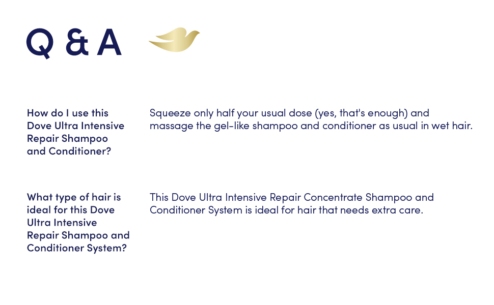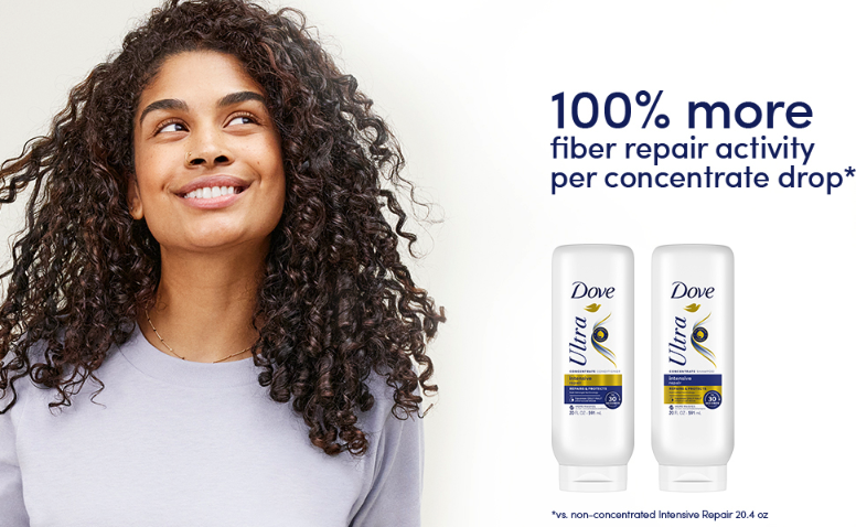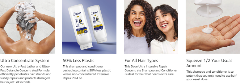 Dove Ultra Intensive Repair Concentrate Shampoo and Conditioner System delivers 2X more washes and 100% more Fiber Repair Activity per drop. With only half your usual dose, the Ultra-Fast Lather and Ultra-Fast Detangle Concentrated Formula efficiently penetrates hair strands and visibly repairs damaged hair. *versus non-concentrated Intensive Repair 20.4 oz