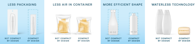 We created Compact by Design to identify products that, while they may not always look very different, have a more efficient design. With the removal of excess air and water, products require less packaging and become more efficient to ship. At scale, these small differences in product size and weight lead to significant carbon emission reductions.