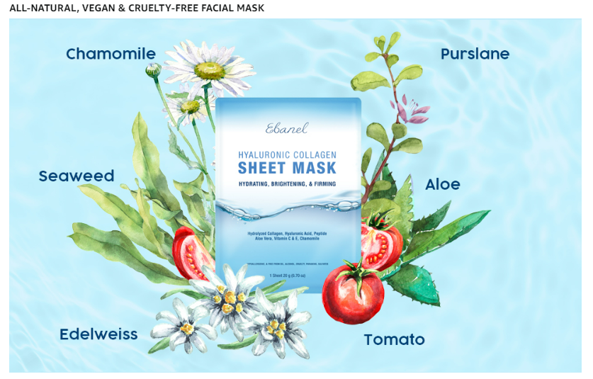 Instant Brightening, Moisturizing Face Mask - Infused with Hyaluronic Acid, Vitamin C, Aloe Vera, and Stem Cell Extracts, this facial mask leaves skin smoother, softer and healthier