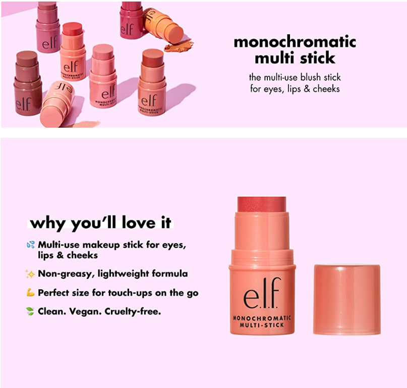 The Monochromatic Multi Stick is your secret weapon to a flawless face. This versatile, multi-use stick can be used on your eyes, lips, and cheeks for a soft, glowy, monochromatic look. After you apply your foundation and setting powder, apply as desired. For a more dramatic look, use along with a bronzer and highlighter. e.l.f. makes the best of beauty accessible to every eye, lip, and face. Your originality is infinite, and we are inspired by what makes you unique. From the early explorer to the trend-obsessed beauty junkie—glam or bare faced, minimalist, maximalist and every look in between—we are for every eye, lip, and face. Proud to be 100% vegan and cruelty-free, worldwide.