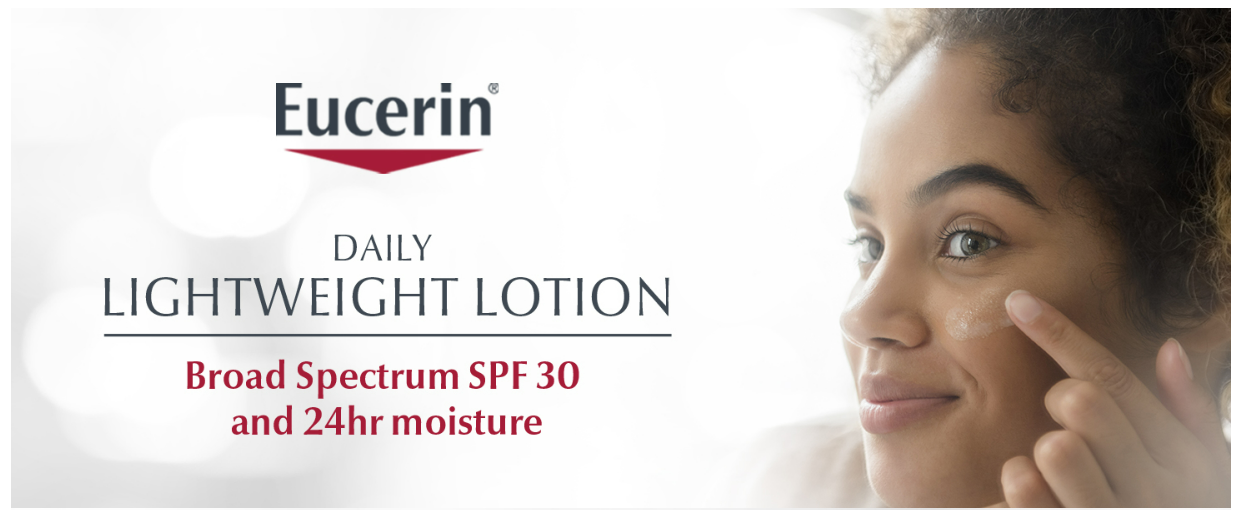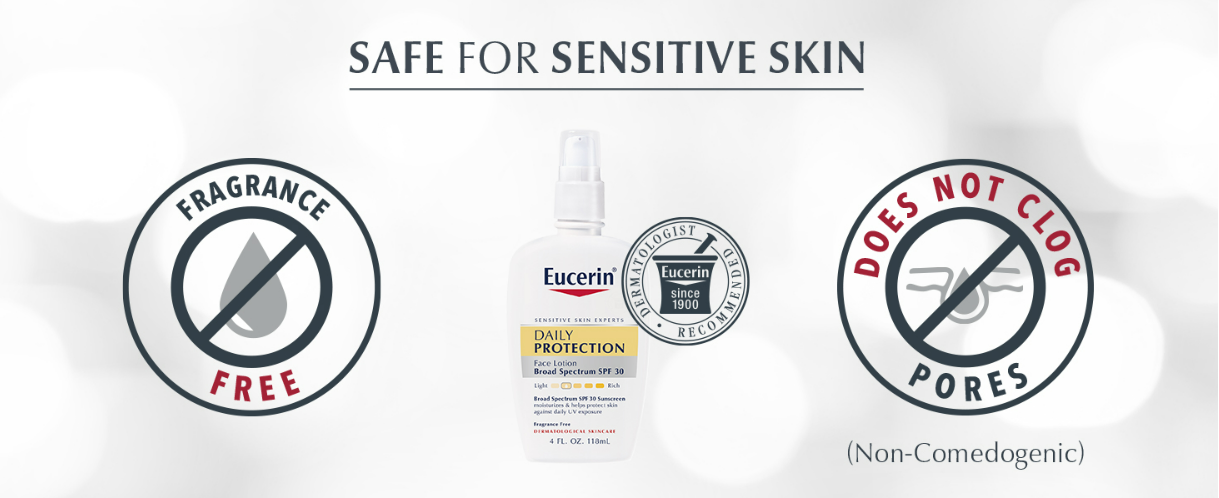 Eucerin’s Daily Protection Face Lotion is a dermatologist recommended, lightweight, broad spectrum SPF 30 moisturizer. Eucerin Daily Protection Face Lotion has UVA/UVB sunscreens, including zinc oxide and titanium dioxide which helps defend against sunburn and long-term sun damage. In addition, it provides 24 hour moisture, is non-comedogenic and is clinically proven to be gentle on sensitive skin.