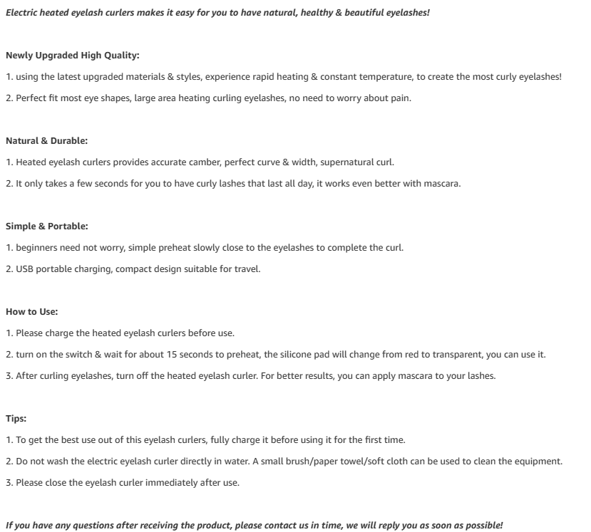 [Natural & Lasting Curling]- This heated eyelash curlers gives you natural curling & healthy eyelashes! The latest temperature control design will not have excessive temperature, but please be sure that the temperature is enough to make your eyelashes curl naturally, ensure that your eyelashes are not harmed. If your eyelashes are hard, you can extend the use time to achieve the perfect curling effect!