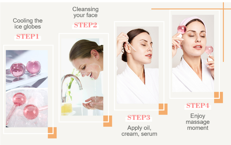 【SAFETY AND SIMPLE USE STEPS】: ①Put globes into the freezer 10~15 mins; ② Apply evenly on your face to the face cream, essential oils or essence; ③ Starting from the neck, gradually pulling the massage from the bottom to top or from the forehead start.