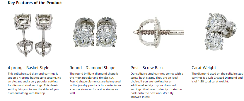 Total 2 stone diamond carat weight 1.50 cttw. minimum clarity VS2-SI1 minimum color I-J. Simple and classic, these solitaires are set in a four prong basket style 14K white gold post setting with screw back closures.