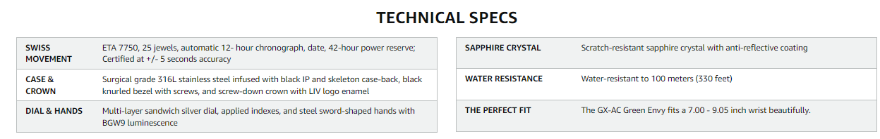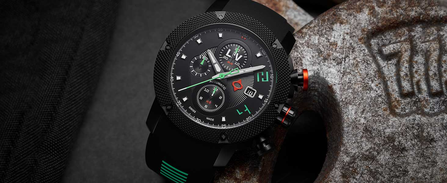 The GX-AC is the big brother to the GX1 watch, packed with features like a 25 Jewel ETA 7750 precision 12-hour Chrono and double sapphire crystal. This timepiece is for those that need a mechanical watch but love a watch that is modern and unique