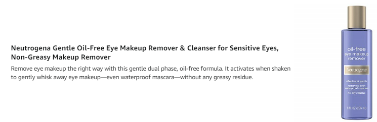 Remove eye makeup in one simple step with Neutrogena Oil-Free Eye Makeup Remover. This dermatologist-developed, dual-phase makeup remover and cleanser formula immediately activates when shaken to gently and effectively remove all eye makeup--even waterproof mascara. This eye makeup remover contains aloe and cucumber extracts to help soothe the skin and work gently without the harsh tugging or pulling. The oil-free, non-greasy liquid makeup remover is ophthalmologist tested, so it's safe for contact lens wearers and those with sensitive eyes. It works quickly and won't leave behind greasy residue.