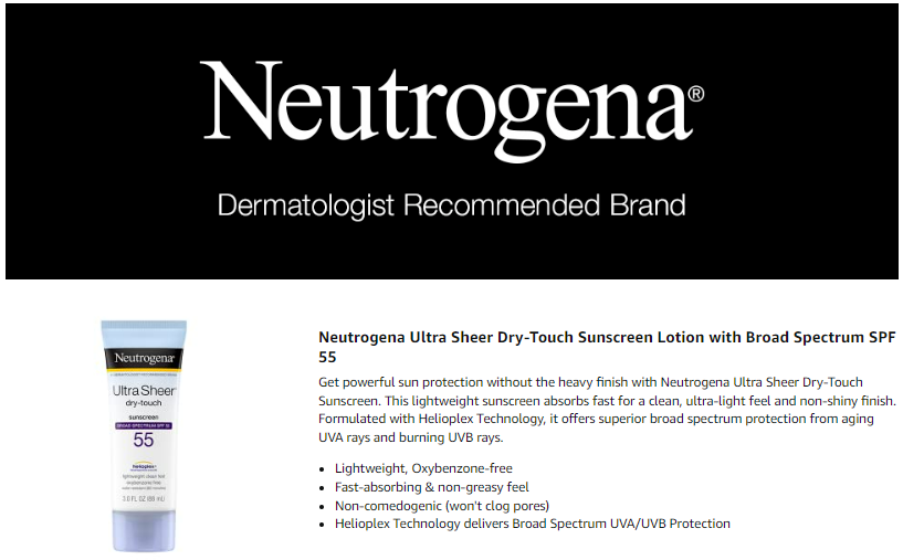 Get powerful sun protection without the heavy finish with Neutrogena Ultra Sheer Dry-Touch Face and Body Sunscreen. This lightweight Broad Spectrum SPF 55 sunscreen lotion for sunburn protection with Dry-Touch technology absorbs fast for a clean feel and non-shiny finish. This sunscreen is formulated with Helioplex Technology, which offers superior broad spectrum protection from skin-aging UVA rays and skin-burning UVB rays. The oxybenzone free sunscreen is fast-absorbing, lightweight and water-resistant up to 80 minutes. The non-greasy sunscreen lotion formula is non-comedogenic and PABA-free leaving a clean feel on skin. Protect yourself as you get your daily dose of sunshine. Apply the dry touch sunscreen for face and body 15 minutes before sun exposure and reapply after 80 minutes swimming or sweating, after towel drying, and at least every two hours.