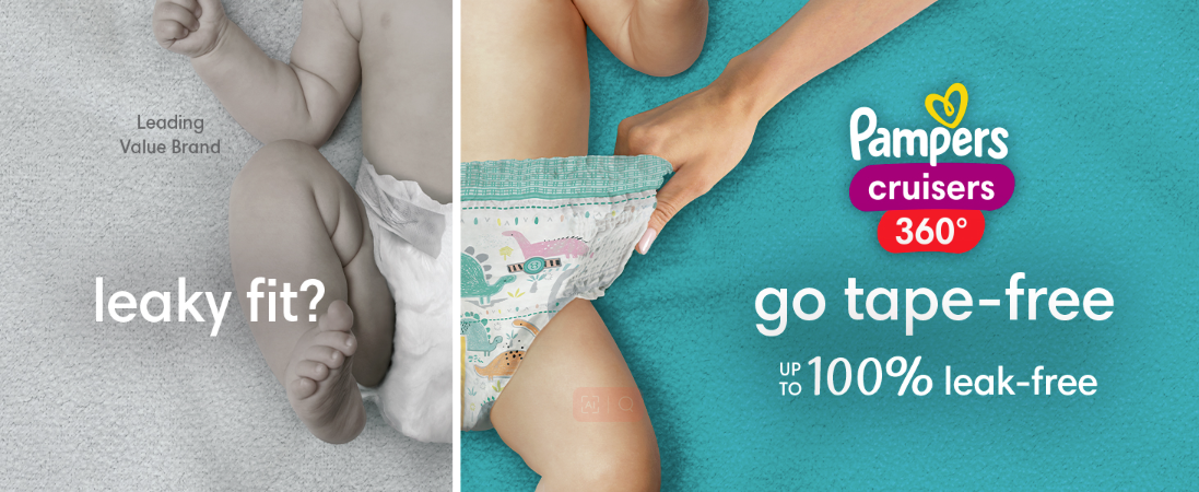 Pampers Cruisers 360 diapers are our best fit and protection for your active baby. Unlike ordinary disposable diapers that gap in the back, Pampers Cruisers 360 diapers stretch comfortably around your baby's waist and adapt to their every move for a flexible, gap-free fit that is up to 100% leakproof. Plus, they feature our Dual Leak-Guard Barriers that gently seal around your baby's legs, where leaks happen most. And forget fiddling with ordinary diaper tapes! Pampers Cruisers 360 has a 360-degree stretchy waistband designed to quickly and easily pull up onto your wiggly baby. And when a diaper change is complete, we’ve made disposal simple. All you need to do is RIP the Easy-Tear Sides and ROLL the diaper, then secure it with the disposal tape that comes attached to the back. Simple as that. Also, to keep your baby's delicate skin healthy, Pampers Cruisers 360 delivers breathable dryness, pulling out wetness and locking it away from skin using our exclusive LockAway Channels. Plus, Cruisers 360 is hypoallergenic—completely free of elemental chlorine bleaching, parabens and latex.* For protection that will keep your little one happy and comfy on-the-go, trust Pampers, the #1 pediatrician recommended brand. *Natural rubber