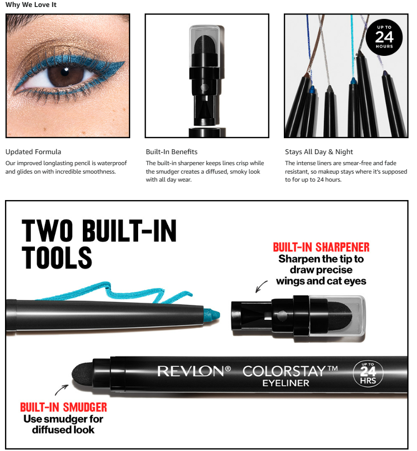 America’s No.1 longwear eyeliner is versatile, intense, and now, even more long-lasting. Our Revlon ColorStay Eyeliners have a new, improved formula that glides on easily and stays where it should for up to 24 hours. Draw precise lines with the sharp pencil tip, or blend and diffuse eye makeup with the built-in smudger for a smoldering, smoky look. It’s one versatile pencil eyeliner that can create classic liner styles like cat eyes, as well as high-drama looks. REVLON calculation based in part on data reported by Nielsen through its ScanTrack Service for the Eye Liner segment for the 52 weeks ending May 23rd, 2020, for the Total U.S. market, xAOC, according to Revlon’s custom product hierarchy. Copyright 2020, The Nielsen Company.