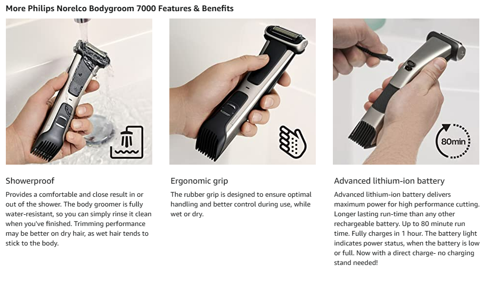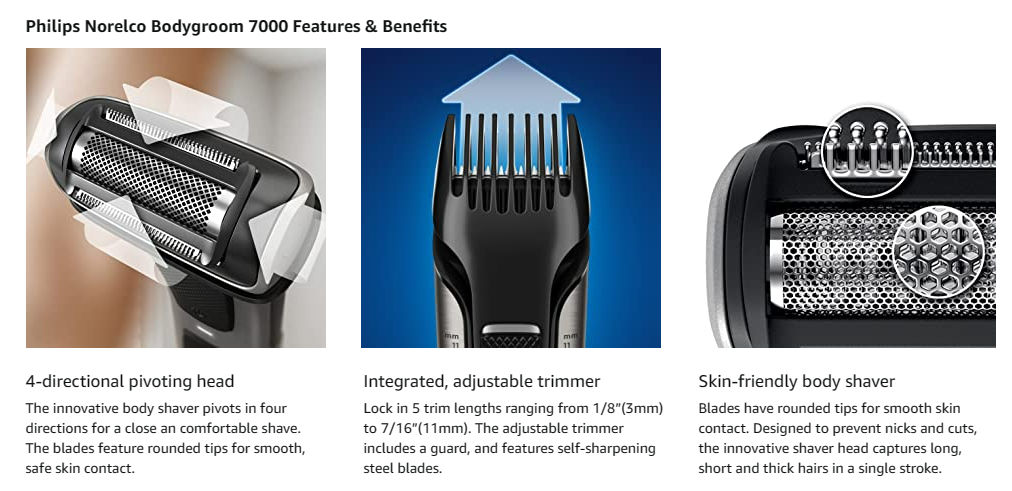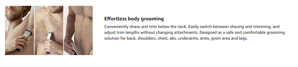 The Bodygroom 7000's unique dual-sided design allows you to effortlessly switch between shaving and trimming. The 4-directional pivoting shaver adapts to the contours of your body for a smooth shave. The integrated trimmer offers five length settings, without changing attachments. The Bodygroom 7000 conveniently features showerproof functionality, and 80 minutes of run time powered by a lithium ion battery.Maintanence free:No Oil needed.