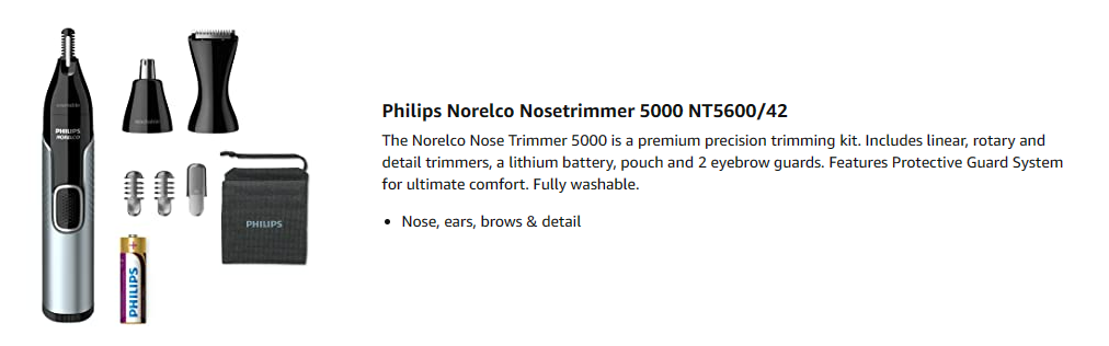 Groom unwanted facial hair using the Philips Norelco Nose Trimmer 5000, a premium precision trimming kit. The Protective Guard System privides the ultimate comfort while the rotary and detail trimmers cuts close. Use the eyebrow attachments to evenly trim your eyebrows. The long-lasting lithium battery provide multiple usage and the pouch makes the trimmer easy travel. The nose trimmer is fully washable, making it easy to clean by simply running under a warm faucet.