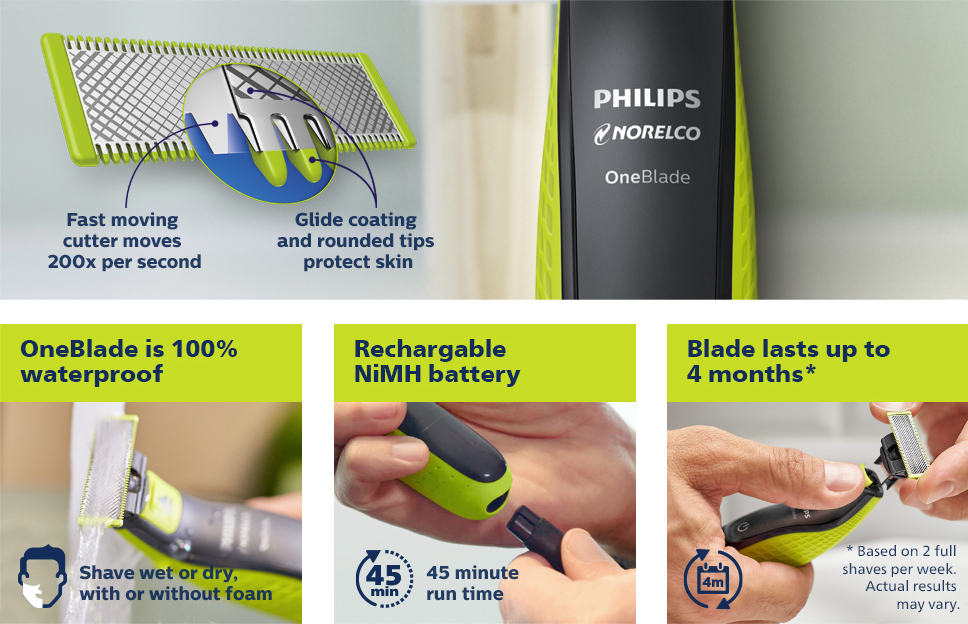 The Philips Norelco OneBlade is a revolutionary new electric grooming technology designed for men who wear facial styles, beards, or stubble. OneBlade trims, edges, and shaves any length of hair. The unique OneBlade shaving technology integrates a fast moving cutter (200x per second) with a dual protection system to give you an efficient comfortable shave on longer hairs. OneBlade does not shave too close, so your skin stays comfortable. The replaceable OneBlades last up to 4 months* (*For best shaving experience. Based on 2 full shaves per week. Actual results may vary.) Subscribe & Save on Philips Norelco OneBlade replacement blades and save up to 15%.