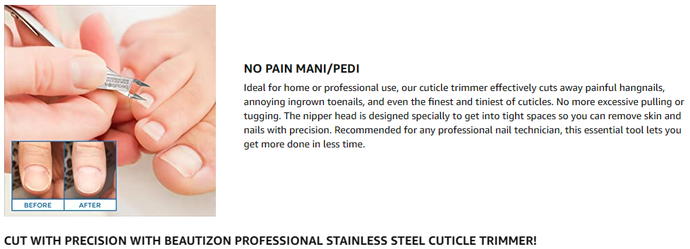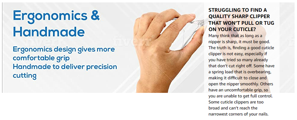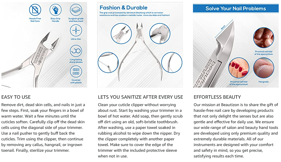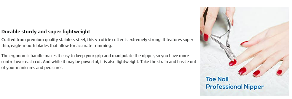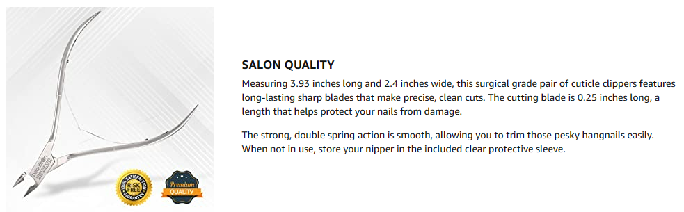 STRUGGLING TO FIND A QUALITY SHARP CLIPPER THAT WON’T PULL OR TUG ON YOUR CUTICLE? Many think that as long as a nipper is sharp, it must be good. The truth is, finding a good cuticle clipper is not easy, especially if you have tried so many already that don’t cut right off. Some have a spring load that is overbearing, making it difficult to close and open the nipper smoothly. Others have an uncomfortable grip, so you are unable to get full control. Some cuticle clippers are too broad and can’t reach the narrowest corners of your nails. SALON QUALITY Measuring 3.93 inches long and 2.4 inches wide, this surgical-grade pair of cuticle clippers features long-lasting sharp blades that make precise, clean cuts. The cutting blade is 0.25 inches long, a length that helps protect your nails from damage. The strong, double spring action is smooth, allowing you to trim those pesky hangnails easily. When not in use, store your nipper in the included clear protective sleeve. Durable sturdy and super lightweight Crafted from premium quality stainless steel, this v-cuticle cutter is extremely strong. It features super-thin, eagle-mouth blades that allow for accurate trimming. The ergonomic handle makes it easy to keep your grip and manipulate the nipper, so you have more control over each cut. And while it may be powerful, it is also lightweight. Take the strain and hassle out of your manicures and pedicures. EFFORTLESS BEAUTY Our mission at Boxgrove Beauty is to share the gift of hassle-free nail care by developing products that not only delight the senses but are also gentle and effective for daily use. We ensure our wide range of salon and beauty hand tools are developed using only premium quality and extremely durable materials. All of our instruments are designed with your comfort and safety in mind, so you get precise, satisfying results each time.