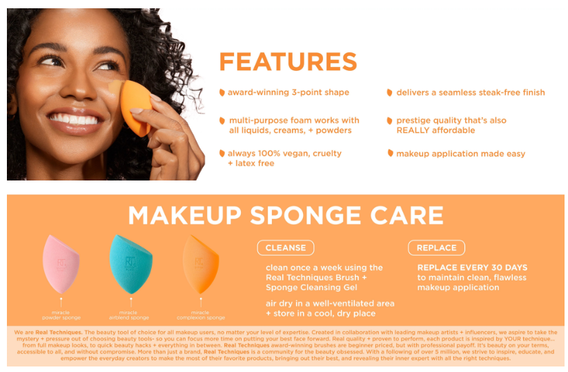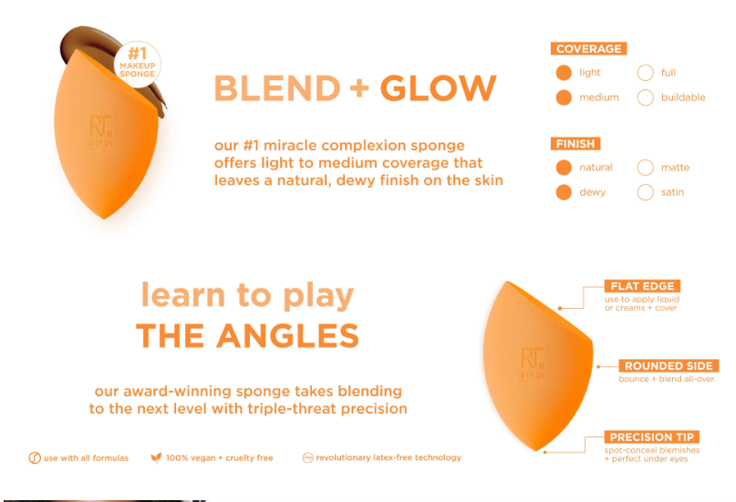 The Real Techniques Miracle Complexion Sponge flawlessly blends liquid and cream products with ease for a streak-free, luminous glow. Our #1 makeup blending sponge offers a natural, dewy finish, and its micro-fine pores help create a seamless base with light to medium coverage. Real Technique’s MCS works best with liquid and cream makeup products such as foundation, skin tints, and illuminators. This makeup sponge has RT's unique 3-point application technique that makes blending products seamless. First use the flat edge of the MCS to pack on product, then the precision tip to conceal, and finally, blend it all out with the rounded side. Use it damp for extra dewiness and let that inner glow shine through. The Miracle Complexion Sponge is easy to clean using our Real Techniques Brush + Sponge Cleansing Gel. It’s also 100% cruelty-free, vegan, and designed with revolutionary latex-free foam technology. Designed by makeup artists. Loved by millions. Real Techniques brings quality makeup brushes and tools used by professional makeup artists to the hands of beauty-obsessed customers around the world. Since 2011, we have been creating tools and accessories to help make the most of your favorite makeup. With a beauty community of over 5 million, Real Techniques® strives to inspire, educate, and empower our fans to make the most of their favorite products. Star products like the Miracle Complexion Sponge make blending foundation and concealer effortless while the Everyday Eye Kit – a handpicked selection of brushes - make a runway-ready smokey eye easily achievable. Real Techniques makes the craft of makeup artistry easy for anyone to understand, whether they’re striving for the best no-makeup look or creating the next viral TikTok video.