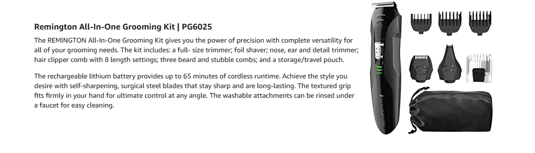 Color:Black The REMINGTON All-In-One Grooming Kit gives you the power of precision with complete versatility for all of your grooming needs. The kit includes: a full- size trimmer; foil shaver; nose, ear and detail trimmer; hair clipper comb with 8 length settings; three beard and stubble combs; and a storage/travel pouch. The rechargeable lithium battery provides up to 70 minutes of cordless runtime. Achieve the style you desire with self-sharpening, surgical steel blades that stay sharp and are long-lasting. The textured grip fits firmly in your hand for ultimate control at any angle. The washable attachments can be rinsed under a faucet for easy cleaning.
