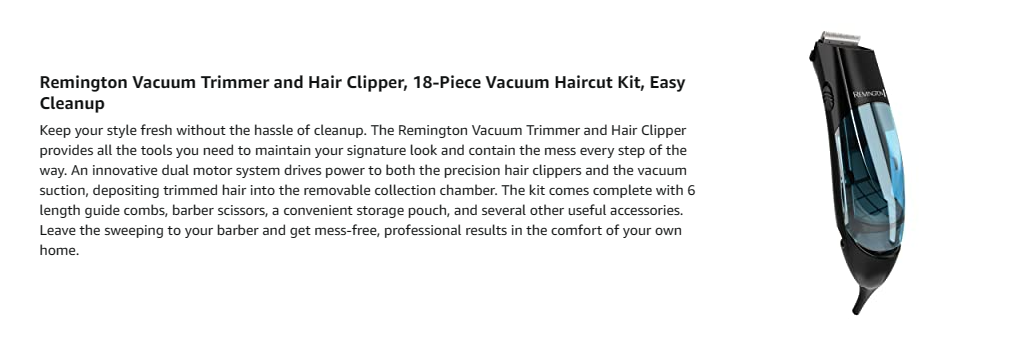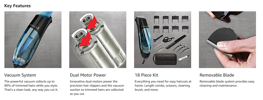 Style Name: HKVAC2000A Keep your style fresh without the hassle of cleanup. The Remington Vacuum 18-piece Haircut Kit provides all the tools you need to maintain your signature look and contain the mess every step of the way. An innovative dual motor system drives power to both the precision hair clippers and the vacuum suction, depositing trimmed hair into the removable collection chamber. The kit comes complete with 6 length-altering combs, barber scissors, a convenient storage pouch, and several other useful accessories. Leave the sweeping to your barber and get mess-free, professional results in the comfort of your own home.