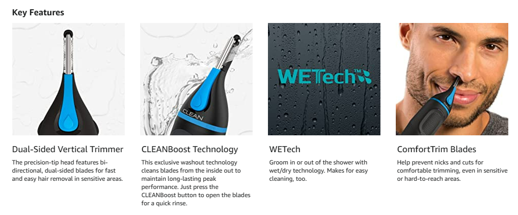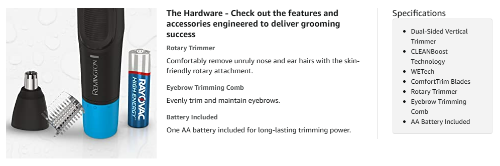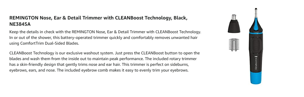 Keep the details in check with the Remington Nose, Ear & Detail Trimmer with Clean Boost Technology. In or out of the shower, this battery-operated trimmer quickly and comfortably removes unwanted hair using Comfort Trim Dual Sided Blades. Clean Boost Technology is our exclusive washout system. Just press the Clean Boost button to open the blades and wash them from the inside out to maintain peak performance. The included rotary trimmer has a skin-friendly design that gently trims nose and ear hair. This trimmer is perfect on sideburns, eyebrows, ears, and nose. The included eyebrow comb makes it easy to evenly trim your eyebrows.