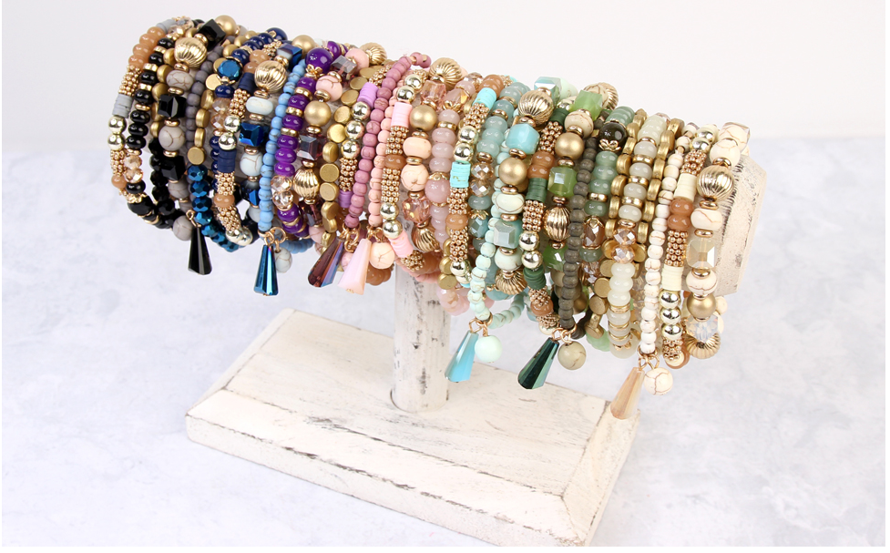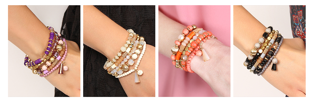Stylish, chic set of bracelets beautifully embellished with colorful beads, acrylic jewel, and a tassel charm. Stack them up for a fun bohemian look or share with your friends as friendship bracelets.