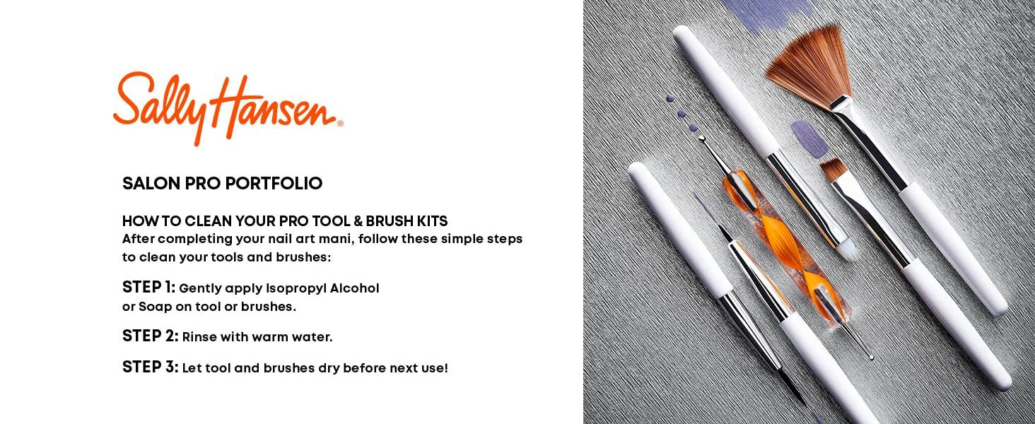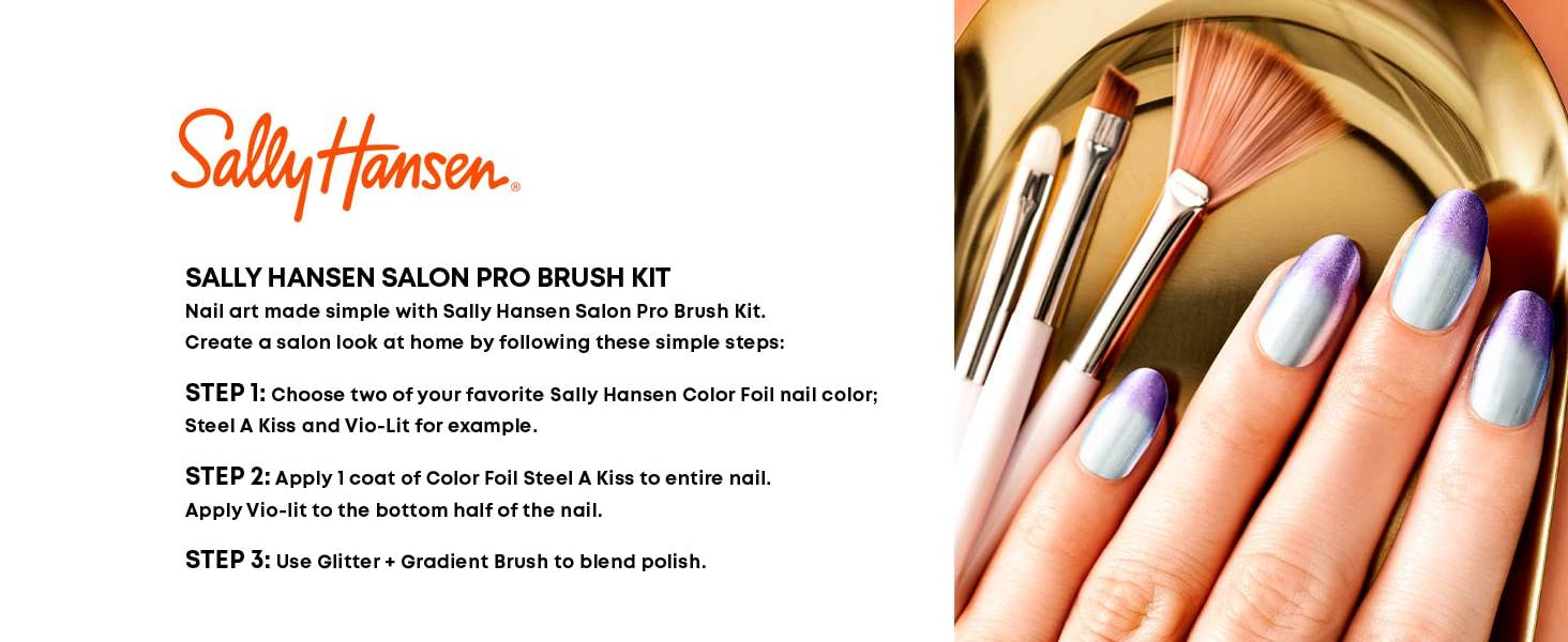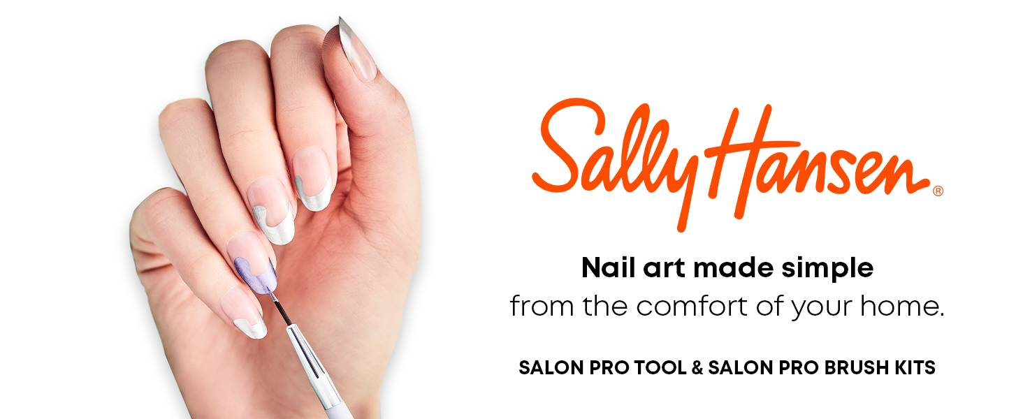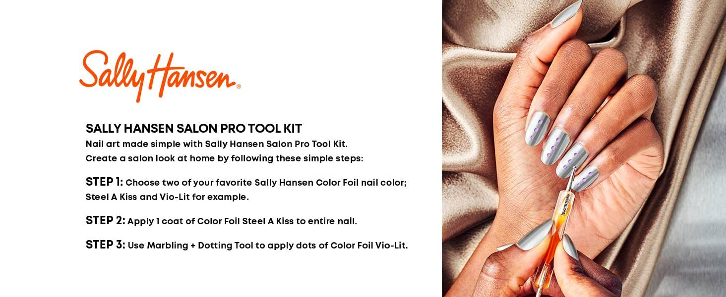 Bring the salon to you with our Sally Hansen Salon Pro Tool Kit. Use the Marbling + Dotting Tool, Detailer Tool, and Striping Brush for all +I16:M16your creative designs from the comfort of your own home. Nail art made simple. Create a salon look at home by following these simple steps: Step 1: Choose two of your favorite Sally Hansen polishes, such as Insta-Dri® Purple Prism and Silver Stallion. Step 2: Apply 1 coat of Insta-Dri Silver Stallion to entire nail. Step 3: Use Marbling + Dotting Tool to apply dots of Insta-Dri Purple Prism.