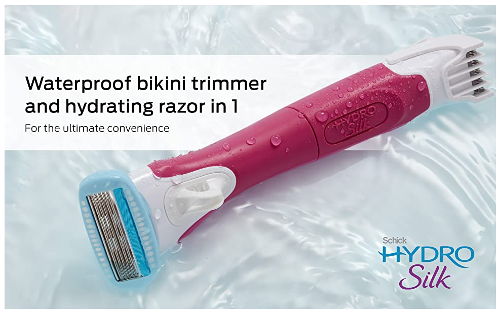 Schick Hydro Silk TrimStyle includes a razor and bikini trimmer in one, hydrating skin up to 2 hours after shaving! This compact 2-in-1 tool offers the ultimate in convenience—with 5 Curve-Sensing Blades that have unique skin guards to reduce irritation, plus a built-in waterproof trimmer that can be used in or out of the shower for convenient bikini maintenance. Combining the uniquely designed Schick Hydro Silk razor with advanced trimming technology, this razor shaves, trims, and transforms with just the flip of a handle.