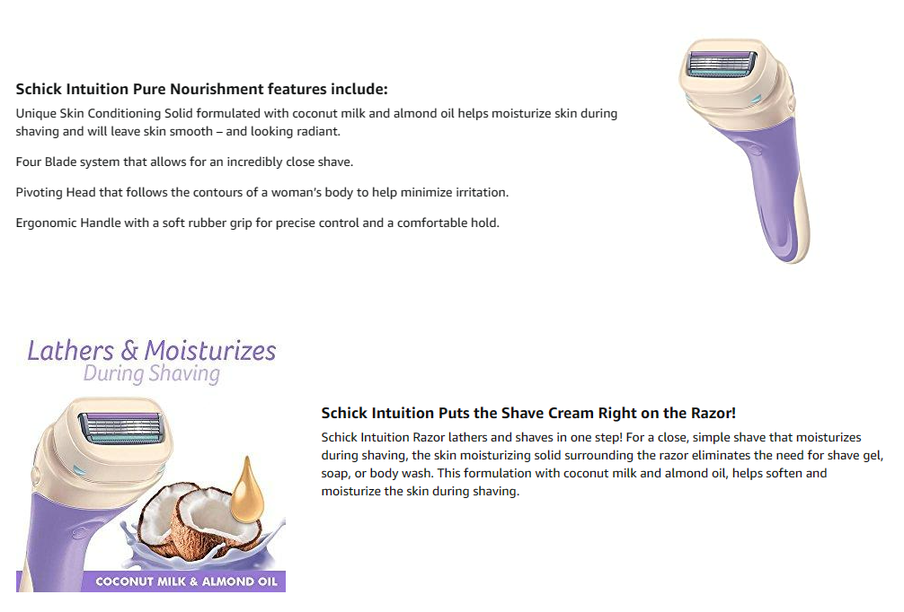 The Schick Intuition Variety Pack includes 4 Schick Intuition razor refills and 1 razor handle, plus a stand-up cap for easy storage. Schick Intuition razors for women lather and shave in one easy step, with no need for shave gel! Each Schick Intuition refill cartridge features a built-in moisturizing bar made with natural and organic ingredients, including natural fragrances. The Intuition Pure Nourishment refill features organic cocoa butter, the Intuition Sensitive Care refill features organic aloe, the Intuition Lemon Berry Breeze refill features organic lemon, and the Intuition Advanced Moisture refill features organic shea butter. Each smooth-gliding 4-blade cartridge has a pivoting head to hug the contours of your legs and body. Schick Intuition Razors help minimize nicks and cuts, making them perfect for first-time shavers.