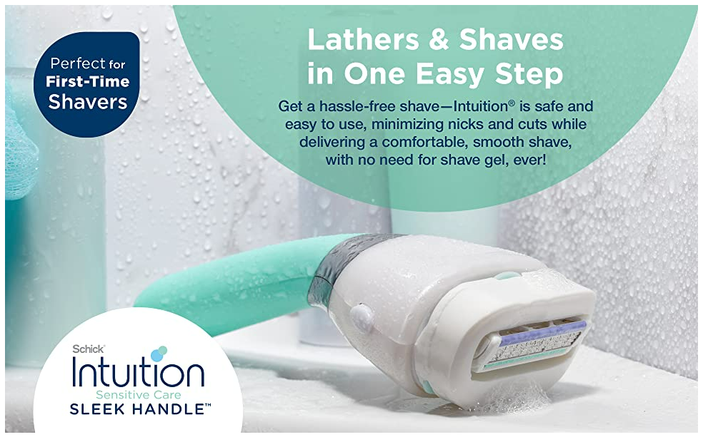 The Schick Intuition Sensitive Care Sleek Handle Razor lathers and shaves in one easy step, with no need for shave gel! It features a sleek razor handle for a comfortable grip and precise control. Plus, the slim-design handle fits all Intuition refills. Each Sensitive Care cartridge features a built-in moisturizing bar made with natural fragrances and organic aloe. The smooth-gliding 4-blade cartridge has a pivoting head to hug the contours of your legs and body. The Schick Intuition Sleek Handle Razor is also perfect for first-time shavers, minimizing nicks and cuts. Each Schick Intuition Sensitive Care Sleek Handle Razor kit includes 1 sleek razor handle, 1 razor cap and 3 razor blade cartridges.
