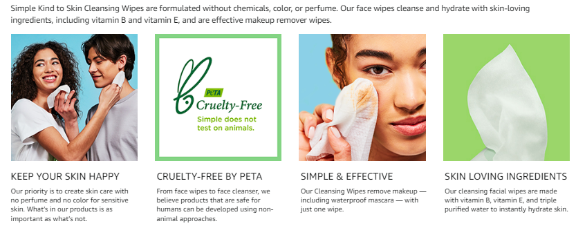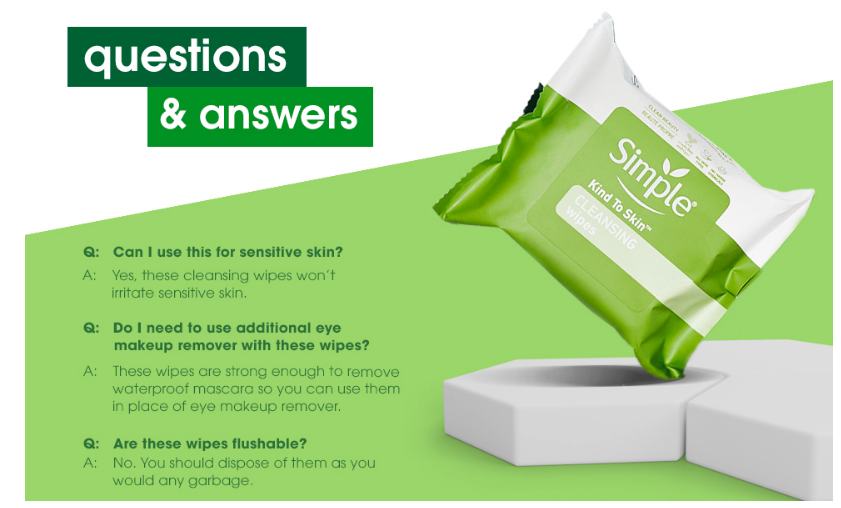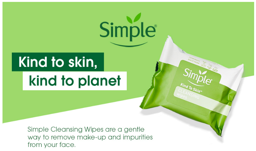 The face cleaning wipes you know and love that are designed to treat your skin with kindness! Simple Kind to Skin Cleansing Wipes are known for being kind to skin and now they are kind to the planet, too. These improved cleansing facial wipes are made of softer-than-silk fibers, gentle cleansers, purified water, and skin-loving ingredients like vitamin B5 and vitamin E.These makeup remover wipes are as safe as they are effective — tough on waterproof mascara, but formulated without fragrance, artificial color, harsh chemicals, drying alcohol, parabens or phthalates. They are also cruelty-free. Our cleansing wipes have the same thickness, softness, strength and stretchiness of other Simple face wipes, but are made with softer-than-silk fibers.To use, simply wipe over eyelids, face, lips and neck, remembering to reseal the pack each time. Do not flush this wipe after using it — the environment will thank you! We are committed to a cleaner future. Our commitment to being cleaner is about holding ourselves to a higher standard and discovering new ways to create effective skincare products that do what they say while being kind to your skin and the planet. We believe in continuously working to be kinder to the planet. That's why Kind to Skin Cleansing Wipes are vegan and Simple is certified Cruelty-Free by PETA, meaning we don't test on animals, anywhere in the world.