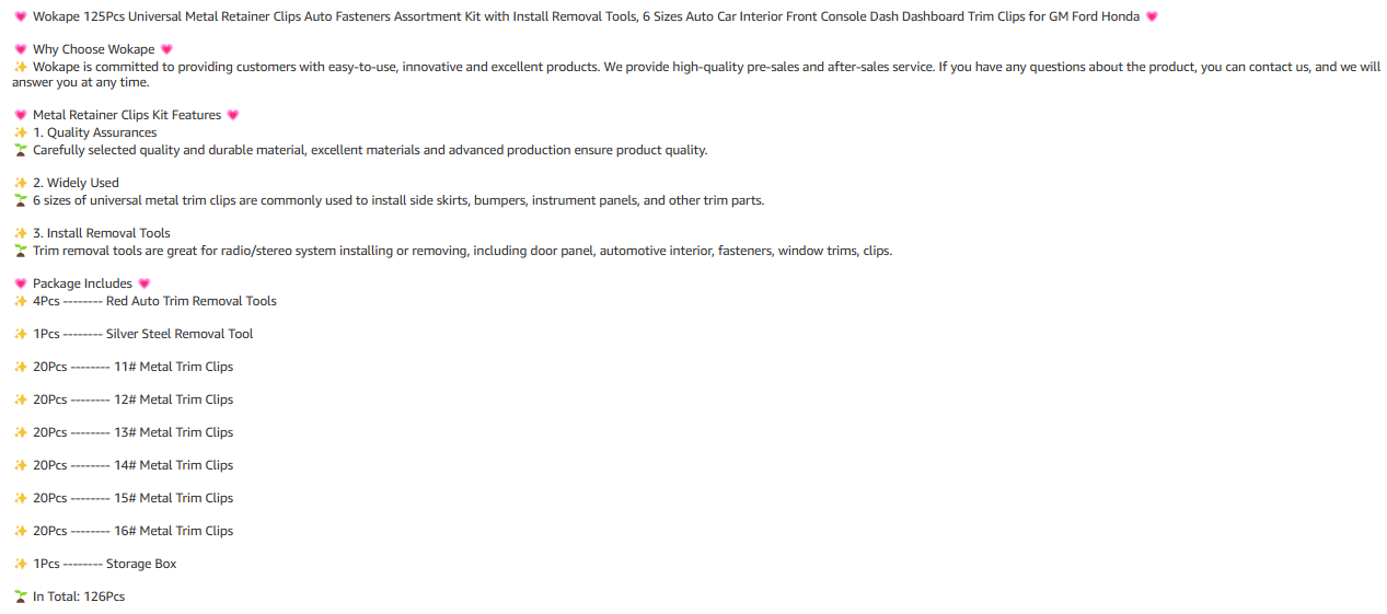 ? 【 Retainer Clips Kit 】 ?: You will get 125Pcs metal trim retainer clips with tools kit, including 6 sizes of metal retainer clips (20 of each size), 4Pcs red nylon trim removal tools and 1Pcs silver steel lifter. Sufficient quantities to meet your need.