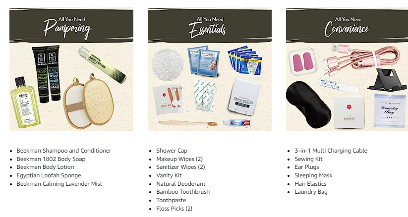 TSA COMPLIANT TRAVEL KIT INCLUDES: Large Capacity Toiletry Bag with Hanger, Extra Long (6.5 ft) Multi Phone Charger, Shampoo and Conditioner, Soap, Sponge, Body Lotion, Deodorant, Sleep Mask, Earplugs, Sanitizing Wipes, Bamboo Toothbrush, Toothpaste, Floss Picks, Makeup Remover Wipes, Laundry Bag, Sewing Kit, Cotton Pads, Q-tips, Nail File. Travel essentials and Travel-Size Toiletries for grooming, hygiene, oral care and comfort for women.